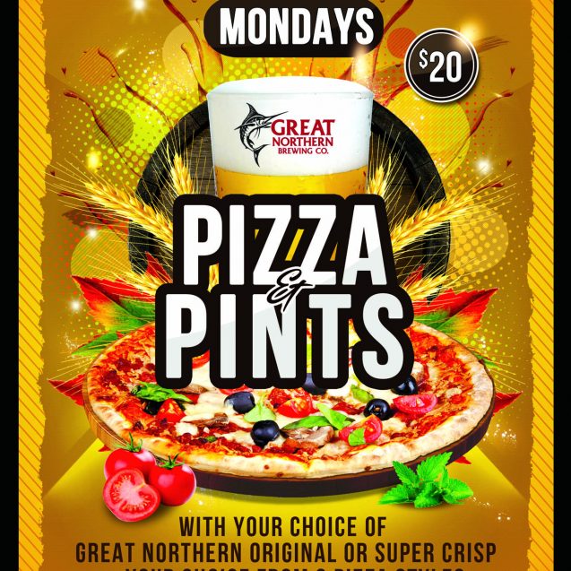 Pizza & Pints with your choice of Great Northern Original or Super Crisp + your choice from 3 pizzas – Supreme, Hawaiian or Vego.